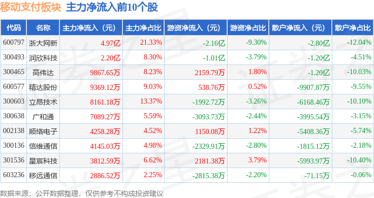 从资金流向上来看,当日移动支付板块主力资金净流入1.91亿元,游资资金净流出4.51亿元,散户资金净流入2.59亿元。移动支付板块个股资金流向见下表: