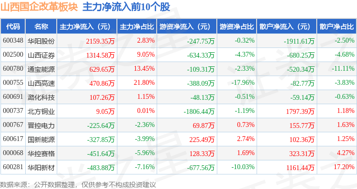 从资金流向上来看,当日山西国企改革板块主力资金净流出1.97亿元,游资资金净流出6074.76万元,散户资金净流入2.58亿元。山西国企改革板块个股资金流向见下表: