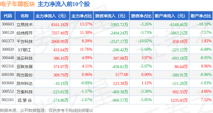 从资金流向上来看,当日电子车牌板块主力资金净流入1.17亿元,游资资金净流出3717.69万元,散户资金净流出7942.61万元。电子车牌板块个股资金流向见下表:
