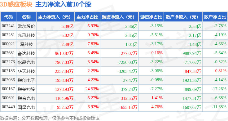 从资金流向上来看,当日3D感应板块主力资金净流出3.45亿元,游资资金净流出1.29亿元,散户资金净流入4.75亿元。3D感应板块个股资金流向见下表: