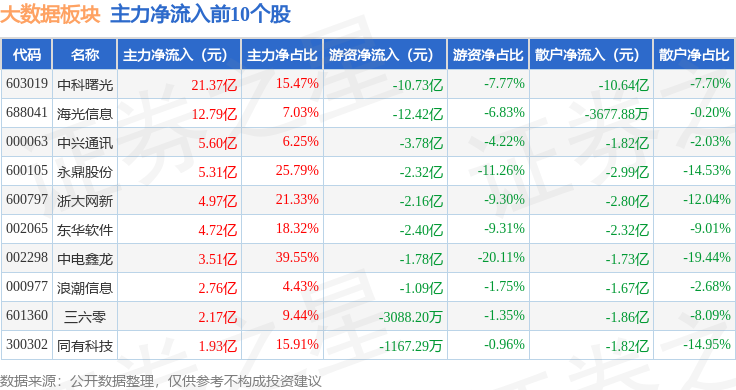 从资金流向上来看,当日大数据板块主力资金净流入31.81亿元,游资资金净流出37.69亿元,散户资金净流入5.88亿元。大数据板块个股资金流向见下表: