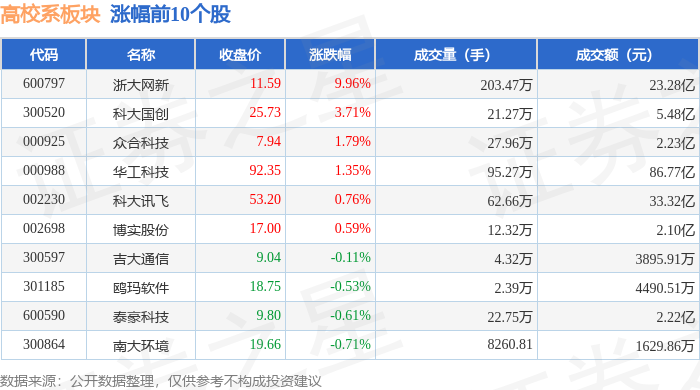 证券之星消息,9月22日高校系板块较上一交易日上涨0.93%,浙大网新领涨。当日上证指数报收于3828.58,上涨0.22%。深证成指报收于13157.97,上涨0.67%。高校系板块个股涨跌见下表: