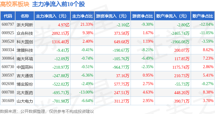 从资金流向上来看,当日高校系板块主力资金净流出1.63亿元,游资资金净流出1457.31万元,散户资金净流入1.78亿元。高校系板块个股资金流向见下表: