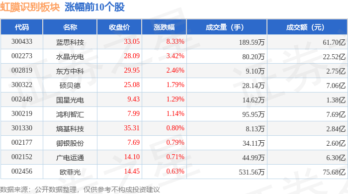 从资金流向上来看,当日虹膜识别板块主力资金净流出5.33亿元,游资资金净流入5804.58万元,散户资金净流入4.75亿元。虹膜识别板块个股资金流向见下表:
