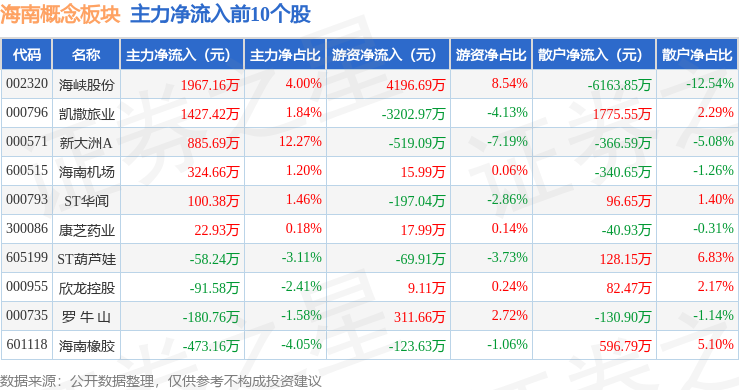 从资金流向上来看,当日海南概念板块主力资金净流出4.42亿元,游资资金净流入1.0亿元,散户资金净流入3.41亿元。海南概念板块个股资金流向见下表: