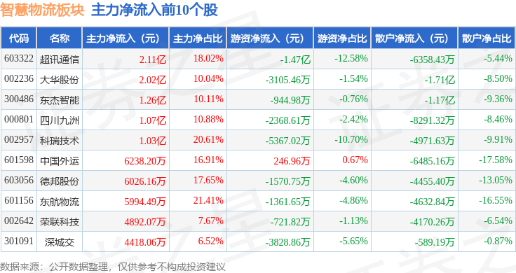 从资金流向上来看,当日智慧物流板块主力资金净流出5.71亿元,游资资金净流出2.66亿元,散户资金净流入8.37亿元。智慧物流板块个股资金流向见下表:
