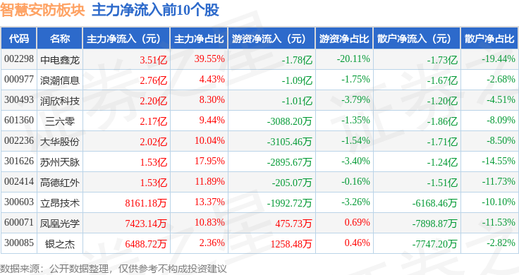 从资金流向上来看,当日智慧安防板块主力资金净流入8.97亿元,游资资金净流出5.92亿元,散户资金净流出3.05亿元。智慧安防板块个股资金流向见下表: