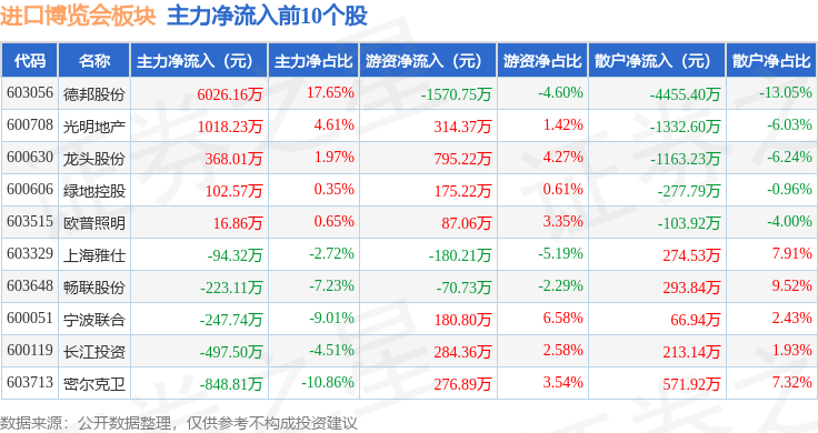 从资金流向上来看,当日进口博览会板块主力资金净流出6548.91万元,游资资金净流入2021.25万元,散户资金净流入4527.66万元。进口博览会板块个股资金流向见下表: