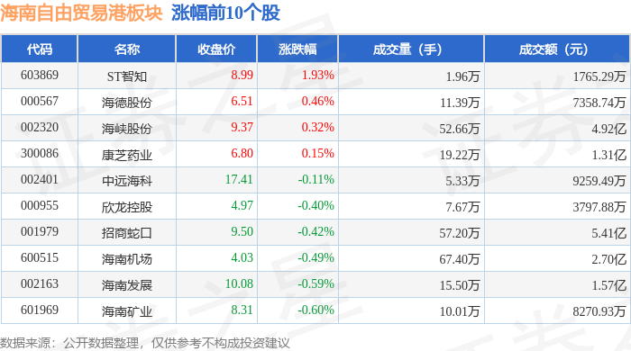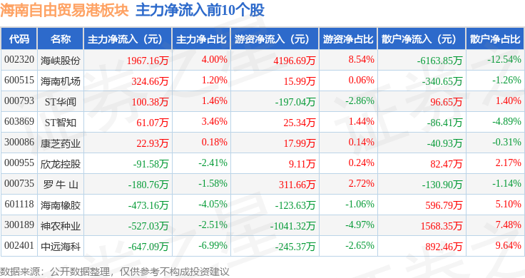 从资金流向上来看,当日海南自由贸易港板块主力资金净流出4.8亿元,游资资金净流入1.04亿元,散户资金净流入3.75亿元。海南自由贸易港板块个股资金流向见下表: