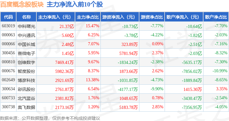 从资金流向上来看,当日百度概念股板块主力资金净流出6.42亿元,游资资金净流出5.78亿元,散户资金净流入12.2亿元。百度概念股板块个股资金流向见下表:
