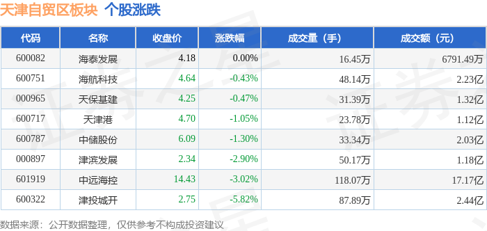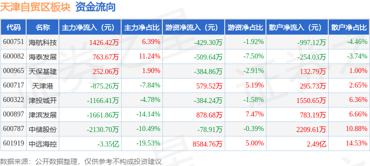 从资金流向上来看,当日天津自贸区板块主力资金净流出3.69亿元,游资资金净流入8256.0万元,散户资金净流入2.87亿元。天津自贸区板块个股资金流向见下表: