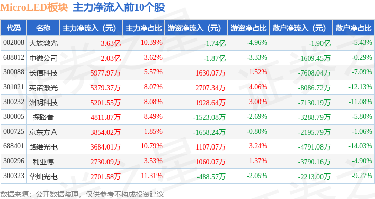 从资金流向上来看,当日MicroLED板块主力资金净流出5.75亿元,游资资金净流入1090.95万元,散户资金净流入5.65亿元。MicroLED板块个股资金流向见下表: