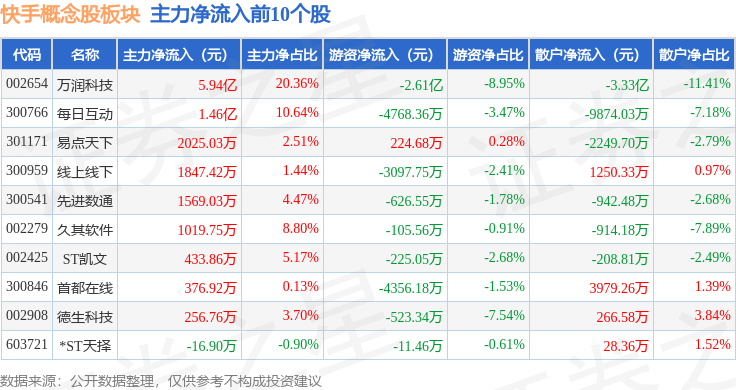 从资金流向上来看,当日快手概念股板块主力资金净流出4.08亿元,游资资金净流出2.73亿元,散户资金净流入6.81亿元。快手概念股板块个股资金流向见下表: