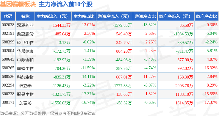 从资金流向上来看,当日基因编辑板块主力资金净流出1.9亿元,游资资金净流出1.21亿元,散户资金净流入3.11亿元。基因编辑板块个股资金流向见下表: