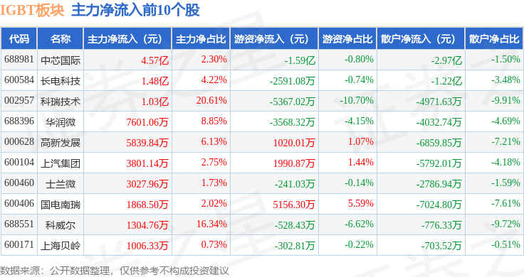 从资金流向上来看,当日IGBT板块主力资金净流出7.87亿元,游资资金净流入2.05亿元,散户资金净流入5.82亿元。IGBT板块个股资金流向见下表: