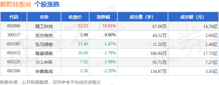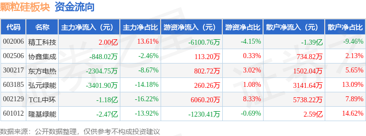 从资金流向上来看,当日颗粒硅板块主力资金净流出2.3亿元,游资资金净流出94.79万元,散户资金净流入2.31亿元。颗粒硅板块个股资金流向见下表: