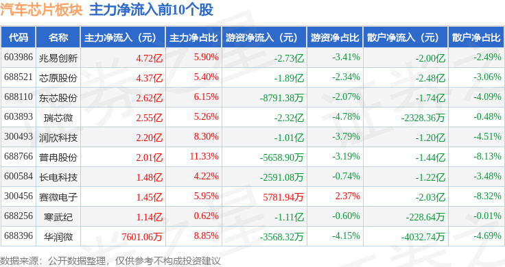 从资金流向上来看,当日汽车芯片板块主力资金净流入9.03亿元,游资资金净流出5.87亿元,散户资金净流出3.16亿元。汽车芯片板块个股资金流向见下表: