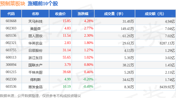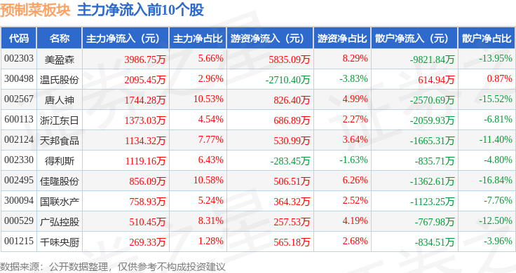 从资金流向上来看,当日预制菜板块主力资金净流出7.66亿元,游资资金净流入1.6亿元,散户资金净流入6.06亿元。预制菜板块个股资金流向见下表: