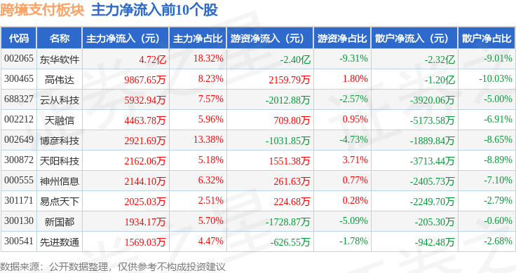从资金流向上来看,当日跨境支付板块主力资金净流出3.65亿元,游资资金净流出1.48亿元,散户资金净流入5.13亿元。跨境支付板块个股资金流向见下表: