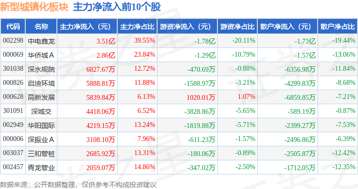 从资金流向上来看,当日新型城镇化板块主力资金净流出1.22亿元,游资资金净流出2.87亿元,散户资金净流入4.08亿元。新型城镇化板块个股资金流向见下表: