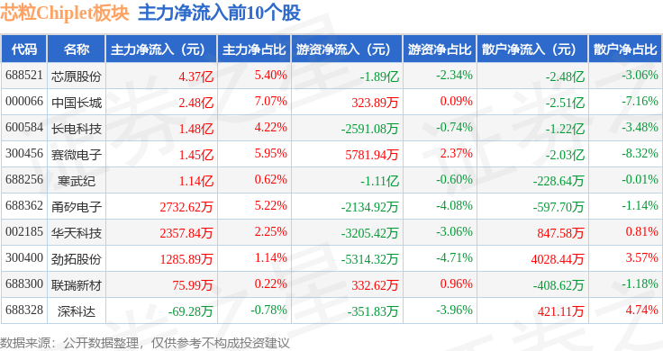 从资金流向上来看,当日芯粒Chiplet板块主力资金净流入11.03亿元,游资资金净流出4.14亿元,散户资金净流出6.9亿元。芯粒Chiplet板块个股资金流向见下表: