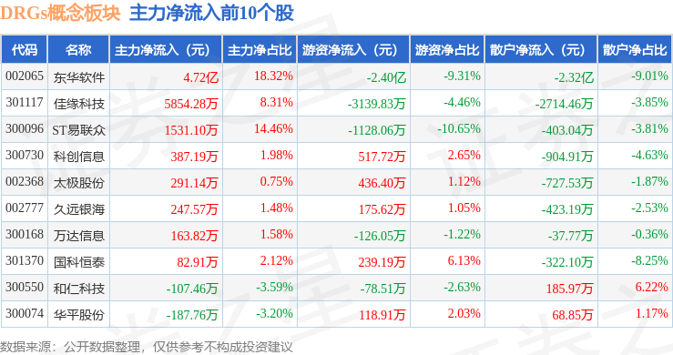 从资金流向上来看,当日DRGs概念板块主力资金净流入1.53亿元,游资资金净流出1.53亿元,散户资金净流入11.26万元。DRGs概念板块个股资金流向见下表: