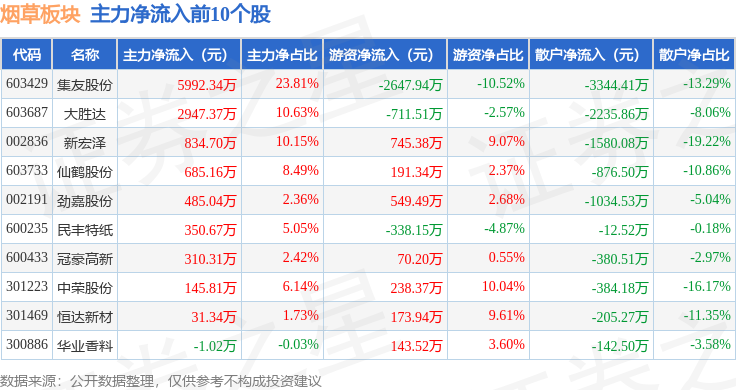 从资金流向上来看,当日烟草板块主力资金净流出1.86亿元,游资资金净流入1637.85万元,散户资金净流入1.69亿元。烟草板块个股资金流向见下表:
