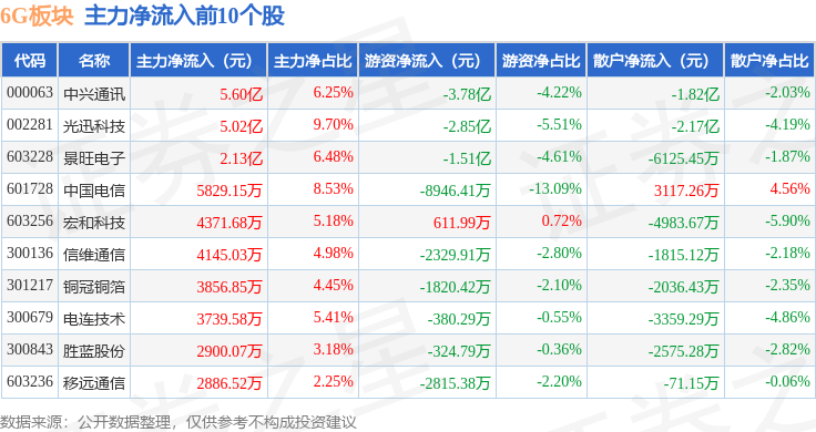 从资金流向上来看,当日6G板块主力资金净流入4.03亿元,游资资金净流出9.9亿元,散户资金净流入5.87亿元。6G板块个股资金流向见下表:
