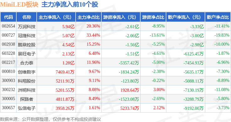 从资金流向上来看,当日MiniLED板块主力资金净流出9.04亿元,游资资金净流入1.39亿元,散户资金净流入7.65亿元。MiniLED板块个股资金流向见下表: