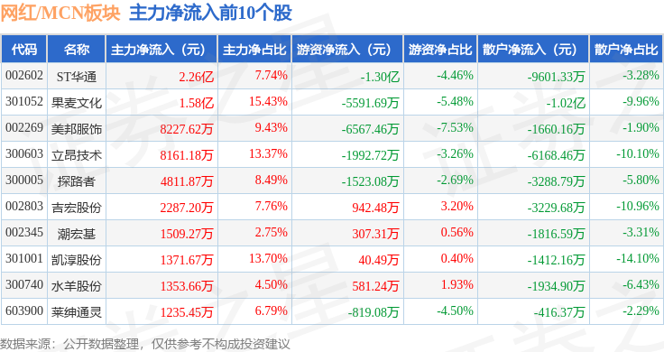 从资金流向上来看,当日网红/MCN板块主力资金净流出18.06亿元,游资资金净流入485.48万元,散户资金净流入18.01亿元。网红/MCN板块个股资金流向见下表: