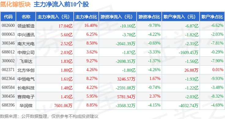 从资金流向上来看,当日氮化镓板块主力资金净流入18.39亿元,游资资金净流出13.47亿元,散户资金净流出4.92亿元。氮化镓板块个股资金流向见下表: