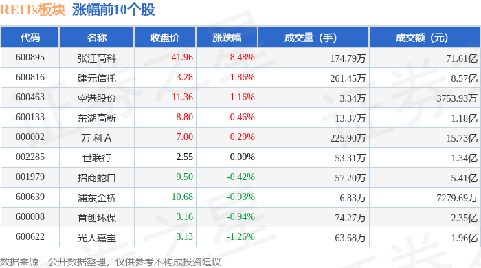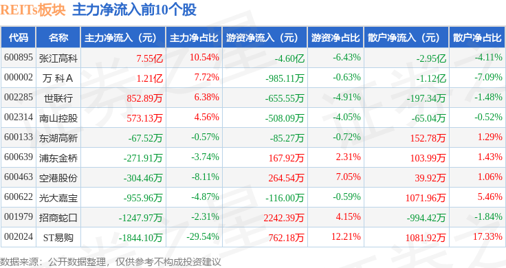从资金流向上来看,当日REITs板块主力资金净流入5.01亿元,游资资金净流出3.82亿元,散户资金净流出1.19亿元。REITs板块个股资金流向见下表: