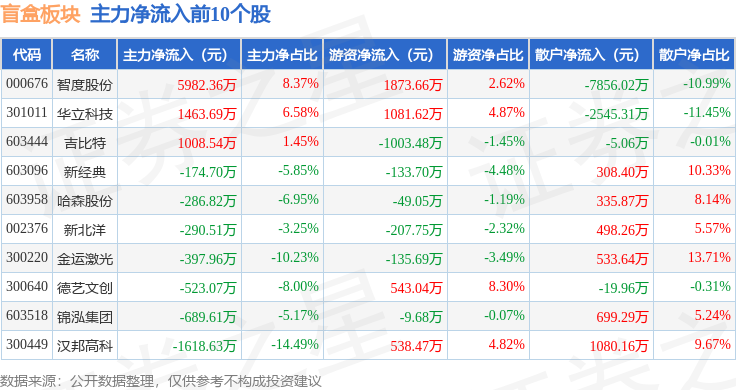 从资金流向上来看,当日盲盒板块主力资金净流出5.39亿元,游资资金净流入4742.0万元,散户资金净流入4.92亿元。盲盒板块个股资金流向见下表: