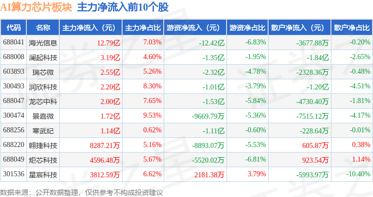 从资金流向上来看,当日AI算力芯片板块主力资金净流入21.99亿元,游资资金净流出23.01亿元,散户资金净流入1.02亿元。AI算力芯片板块个股资金流向见下表: