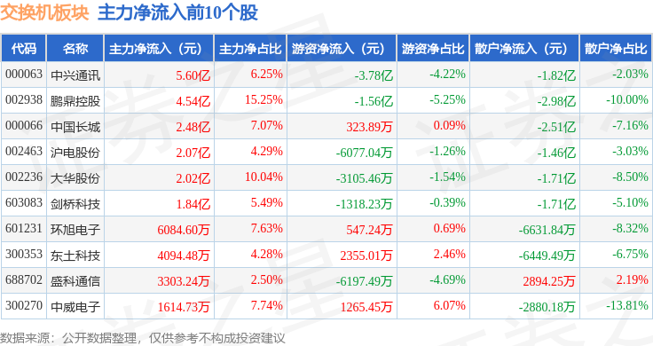 从资金流向上来看,当日交换机板块主力资金净流入14.79亿元,游资资金净流出6.67亿元,散户资金净流出8.12亿元。交换机板块个股资金流向见下表: