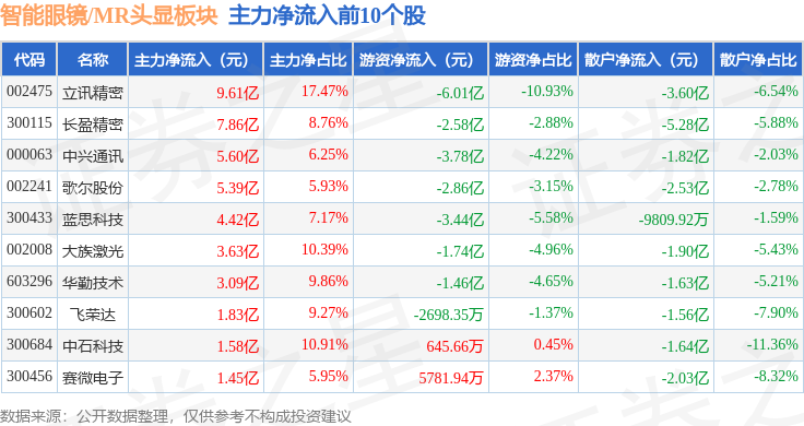 从资金流向上来看,当日智能眼镜/MR头显板块主力资金净流入15.85亿元,游资资金净流出14.77亿元,散户资金净流出1.07亿元。智能眼镜/MR头显板块个股资金流向见下表: