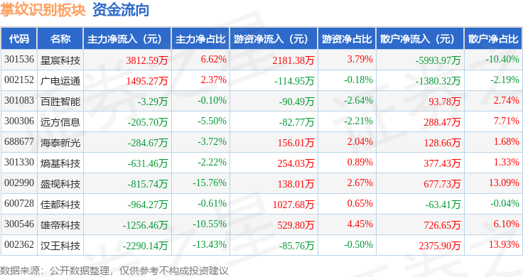 从资金流向上来看,当日掌纹识别板块主力资金净流出1143.86万元,游资资金净流入3912.94万元,散户资金净流出2769.08万元。掌纹识别板块个股资金流向见下表:
