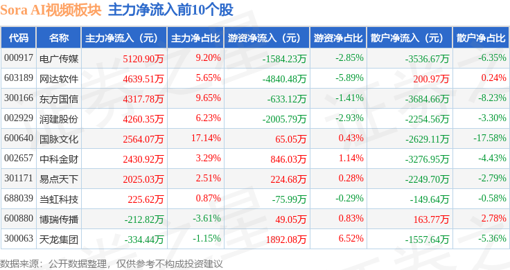 从资金流向上来看,当日Sora AI视频板块主力资金净流出2.45亿元,游资资金净流出1572.69万元,散户资金净流入2.61亿元。Sora AI视频板块个股资金流向见下表: