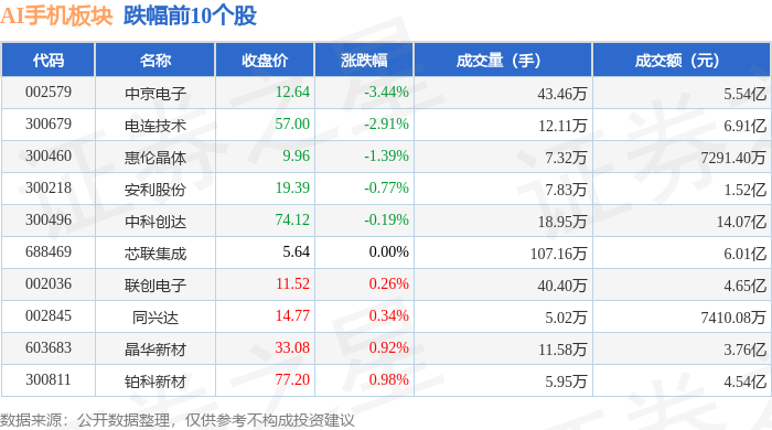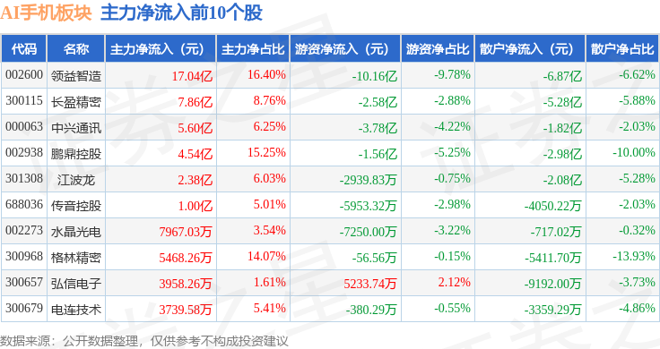 从资金流向上来看,当日AI手机板块主力资金净流入34.75亿元,游资资金净流出18.55亿元,散户资金净流出16.19亿元。AI手机板块个股资金流向见下表: