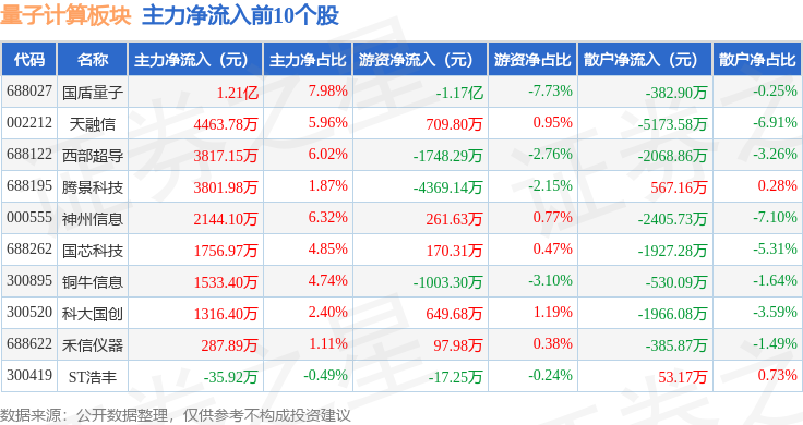 从资金流向上来看,当日量子计算板块主力资金净流入2.89亿元,游资资金净流出1.54亿元,散户资金净流出1.35亿元。量子计算板块个股资金流向见下表: