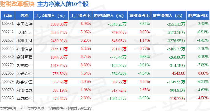 从资金流向上来看,当日财税改革板块主力资金净流出3.81亿元,游资资金净流出3368.09万元,散户资金净流入4.15亿元。财税改革板块个股资金流向见下表: