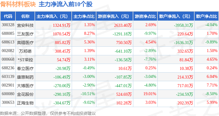 从资金流向上来看,当日骨科材料板块主力资金净流出3.61亿元,游资资金净流入9214.1万元,散户资金净流入2.69亿元。骨科材料板块个股资金流向见下表: