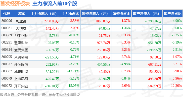 从资金流向上来看,当日首发经济板块主力资金净流出1.36亿元,游资资金净流入3340.36万元,散户资金净流入1.03亿元。首发经济板块个股资金流向见下表: