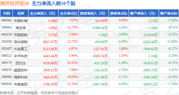 从资金流向上来看,当日海洋经济板块主力资金净流入4.27亿元,游资资金净流出1.76亿元,散户资金净流出2.52亿元。海洋经济板块个股资金流向见下表: