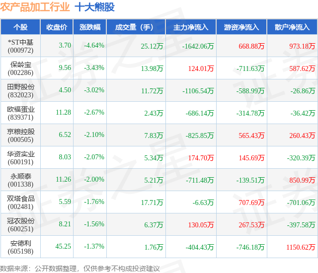 个股表现方面,农产品加工行业当日领跌股为*ST中基(000972),该股当日报收3.7,下跌4.64%,成交量25.12万,主力资金净流出1642.06万元。保龄宝(002286)以下跌3.43%紧随其后,该股当日成交量13.98万,主力资金净流入124.01万元。除此之外,田野股份(832023)、欧福蛋业(839371)、京粮控股(000505)均进入当日熊股之列。具体个股列表见下表: