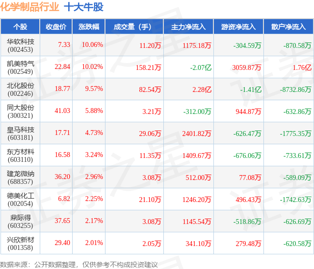 个股表现方面,化学制品行业当日领涨股为华软科技(002453),该股当日报收7.33,上涨10.06%,成交量11.2万,主力资金净流入1175.18万元。凯美特气(002549)以上涨10.02%紧随其后,该股当日成交量158.21万,主力资金净流出2.07亿元。除此之外,北化股份(002246)、同大股份(300321)、皇马科技(603181)均进入当日牛股之列。具体个股列表见下表: