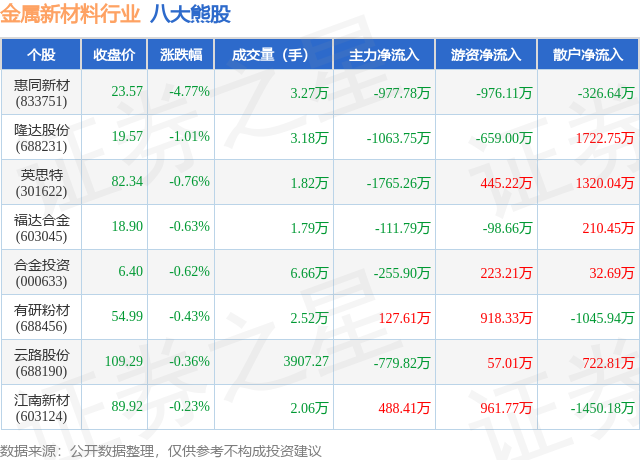 个股表现方面,金属新材料行业当日领跌股为惠同新材(833751),该股当日报收23.57,下跌4.77%,成交量3.27万,主力资金净流出977.78万元。隆达股份(688231)以下跌1.01%紧随其后,该股当日成交量3.18万,主力资金净流出1063.75万元。除此之外,英思特(301622)、福达合金(603045)、合金投资(000633)均进入当日熊股之列。具体个股列表见下表: