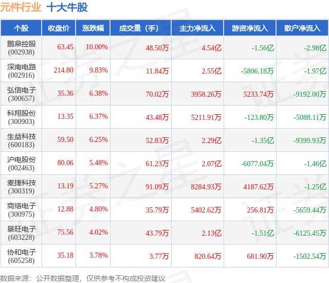 个股表现方面,元件行业当日领涨股为鹏鼎控股(002938),该股当日报收63.45,上涨10.0%,成交量48.5万,主力资金净流入4.54亿元。深南电路(002916)以上涨9.83%紧随其后,该股当日成交量11.84万,主力资金净流入2.55亿元。除此之外,弘信电子(300657)、科翔股份(300903)、生益科技(600183)均进入当日牛股之列。具体个股列表见下表: