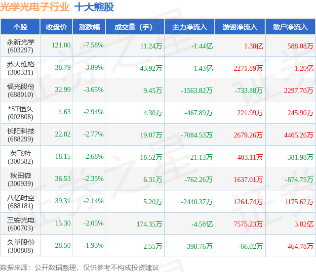 个股表现方面,光学光电子行业当日领跌股为永新光学(603297),该股当日报收121.0,下跌7.58%,成交量11.24万,主力资金净流出1.44亿元。苏大维格(300331)以下跌3.89%紧随其后,该股当日成交量43.92万,主力资金净流出1.43亿元。除此之外,福光股份(688010)、*ST恒久(002808)、长阳科技(688299)均进入当日熊股之列。具体个股列表见下表: