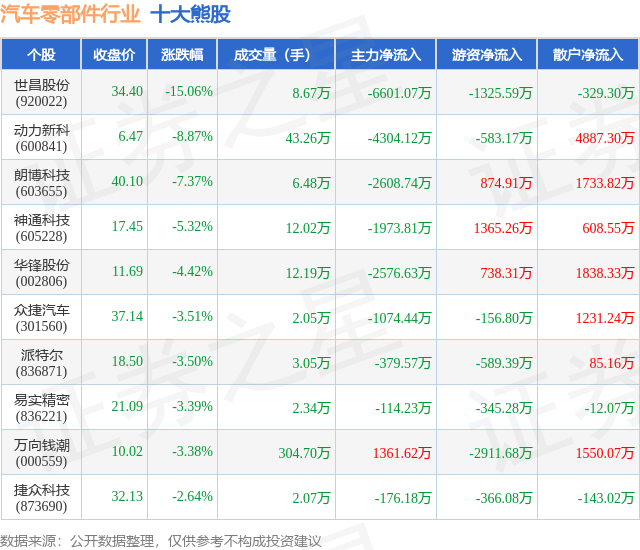 个股表现方面,汽车零部件行业当日领跌股为世昌股份(920022),该股当日报收34.4,下跌15.06%,成交量8.67万,主力资金净流出6601.07万元。动力新科(600841)以下跌8.87%紧随其后,该股当日成交量43.26万,主力资金净流出4304.12万元。除此之外,朗博科技(603655)、神通科技(605228)、华锋股份(002806)均进入当日熊股之列。具体个股列表见下表: